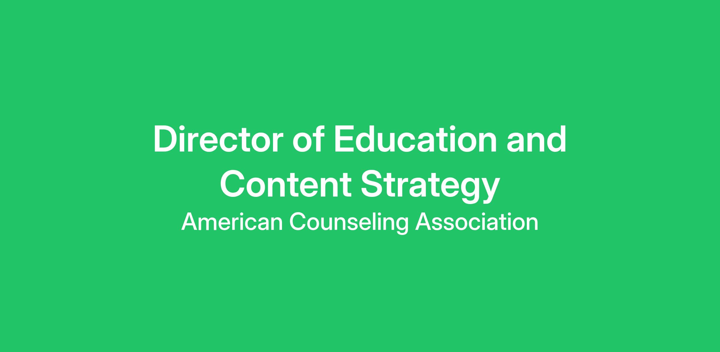 The Director of Education & Content Strategy is responsible for developing the strategy and administering the content delivered for professional development and online resources. The Director is responsible for planning, executing, and evaluating content and education strategies that align with ACA’s strategic plan and membership needs. The Director will work in conjunction with leadership to design and implement innovative instructional design and delivery efforts. This is a hands-on role directly responsible for managing the development and administration of content for education programs for members and/or the public. This position has supervisory responsibilities.