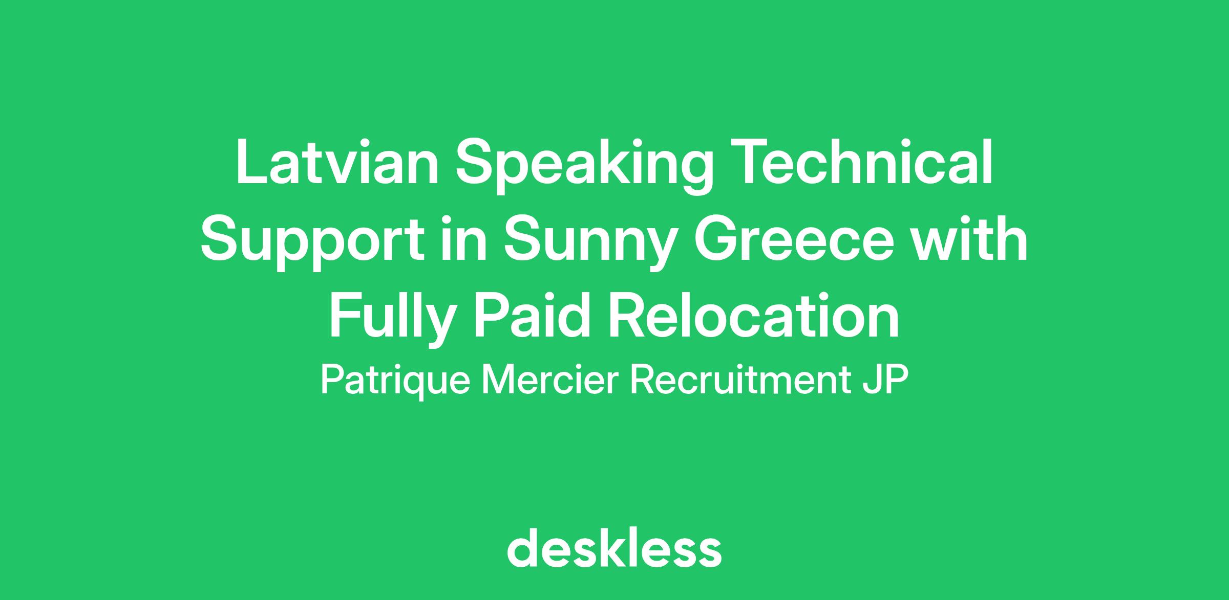 DescriptionPatrique Mercier Recruitment JP is thrilled to offer an amazing opportunity for a Latvian Speaking Technical Support Specialist in sunny Greece! This unique position comes with a fully paid relocation package, making it easier for you to transition to your new adventure on the beautiful Mediterranean coast. In this role, you will provide outstanding technical assistance to Latvian-speaking customers, addressing various inquiries related to innovative technology products and services. Join a vibrant team where your skills and passion for technology will be valued, and enjoy the sun and warmth of Greece while you work!