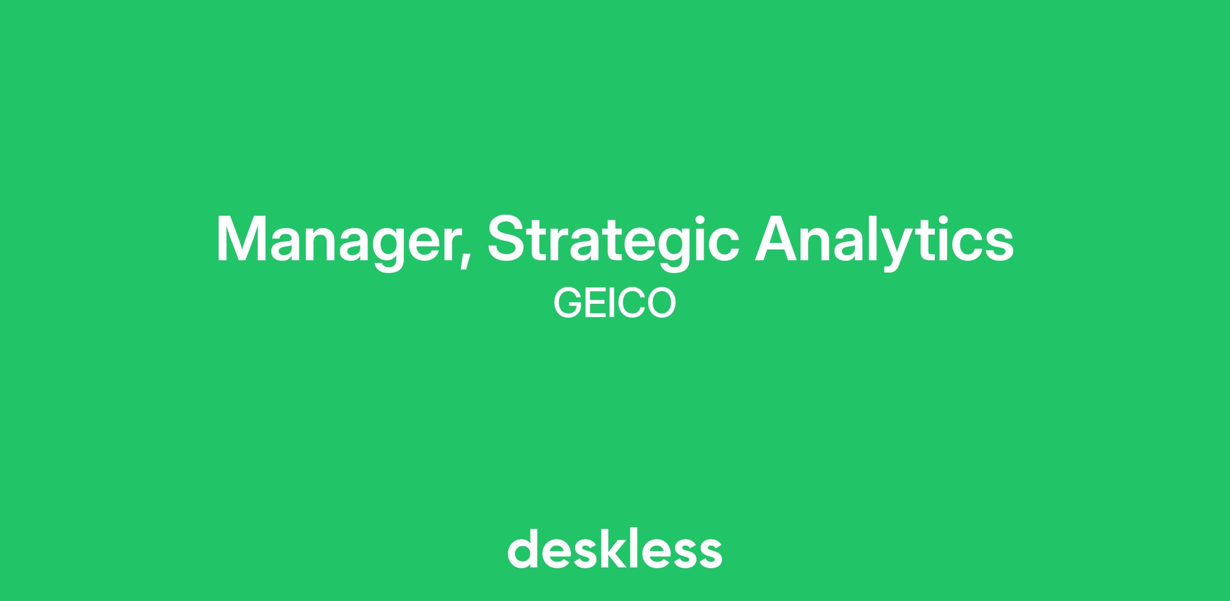 GEICO is hiring a Manager, Strategic Analytics, to join their Claims Innovation team. As a Manager, you will lead Strategic Analytics efforts in identifying, analyzing, and implementing opportunities to improve our strategies, market approach, processes, and technology. This role partners with cross-functional teams within and without Claims Innovation to deliver innovative solutions that enhance efficiency, accuracy, and customer experience.