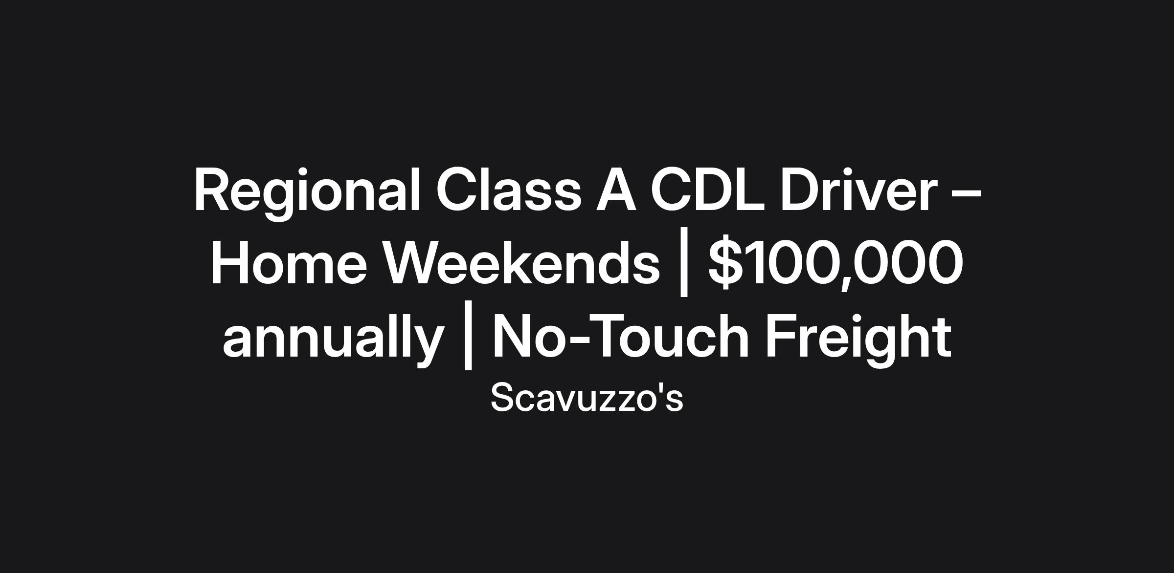 Regional Class A CDL Driver – Home Weekends | $100,000 | No-Touch Freight Scavuzzo’s Inc.Scavuzzo’s Inc., a well-established, family-owned company, is hiring Regional Class A CDL Drivers. If you’re looking for consistent miles, strong weekly pay, and guaranteed weekends at home, we’d love to talk with you.
